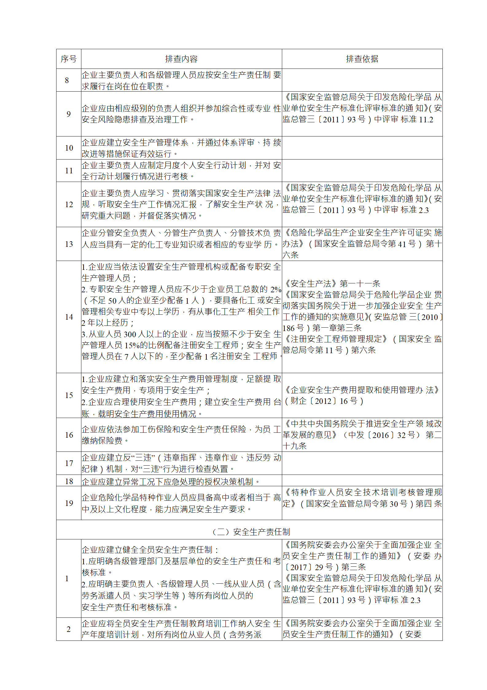 (2)綜合性排查是指以安全生產責任制、各項專業(yè)管理制 度、安全生產管理制度和化工過程安全管理各要素落實情況為重點開展的全面檢查;