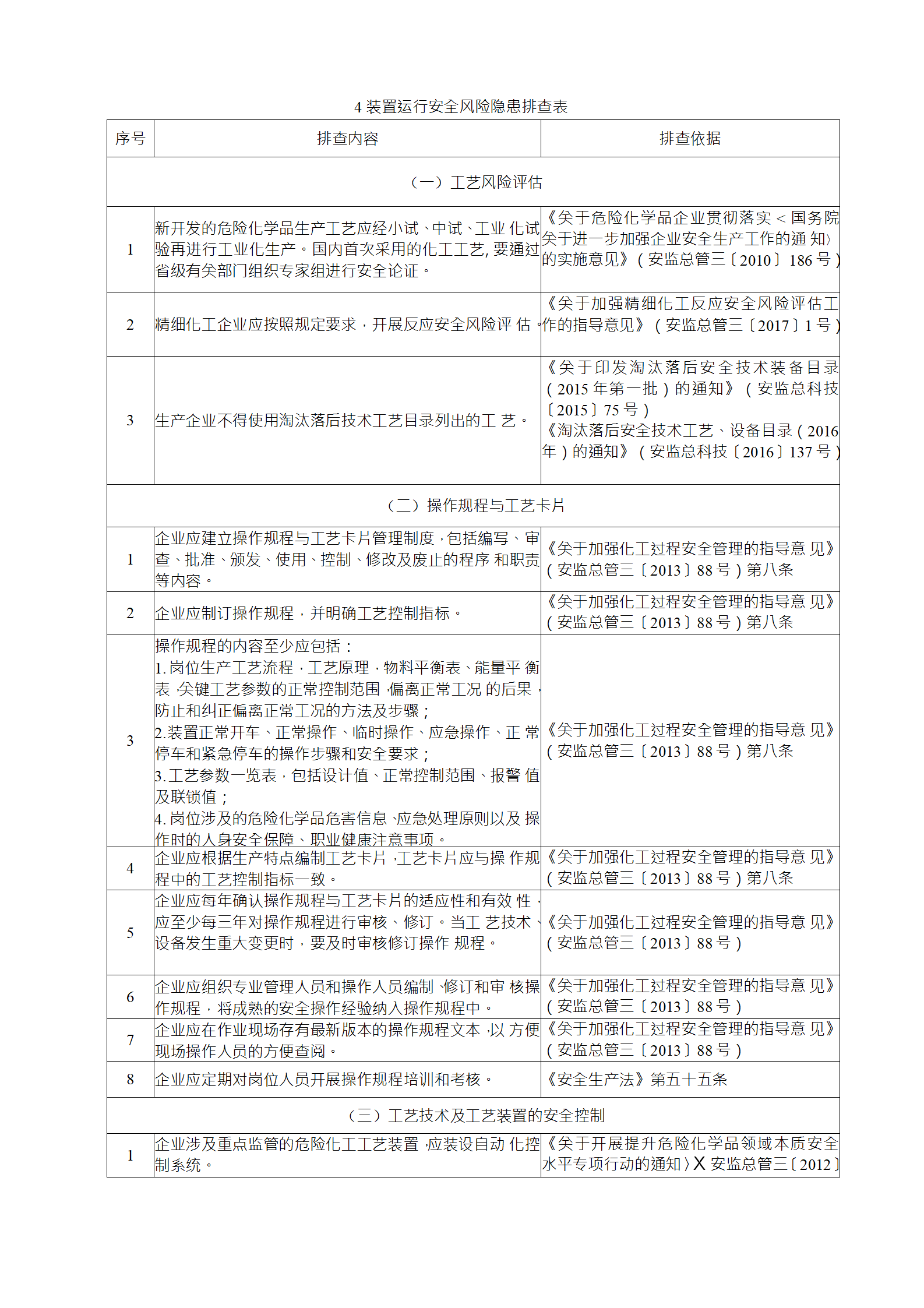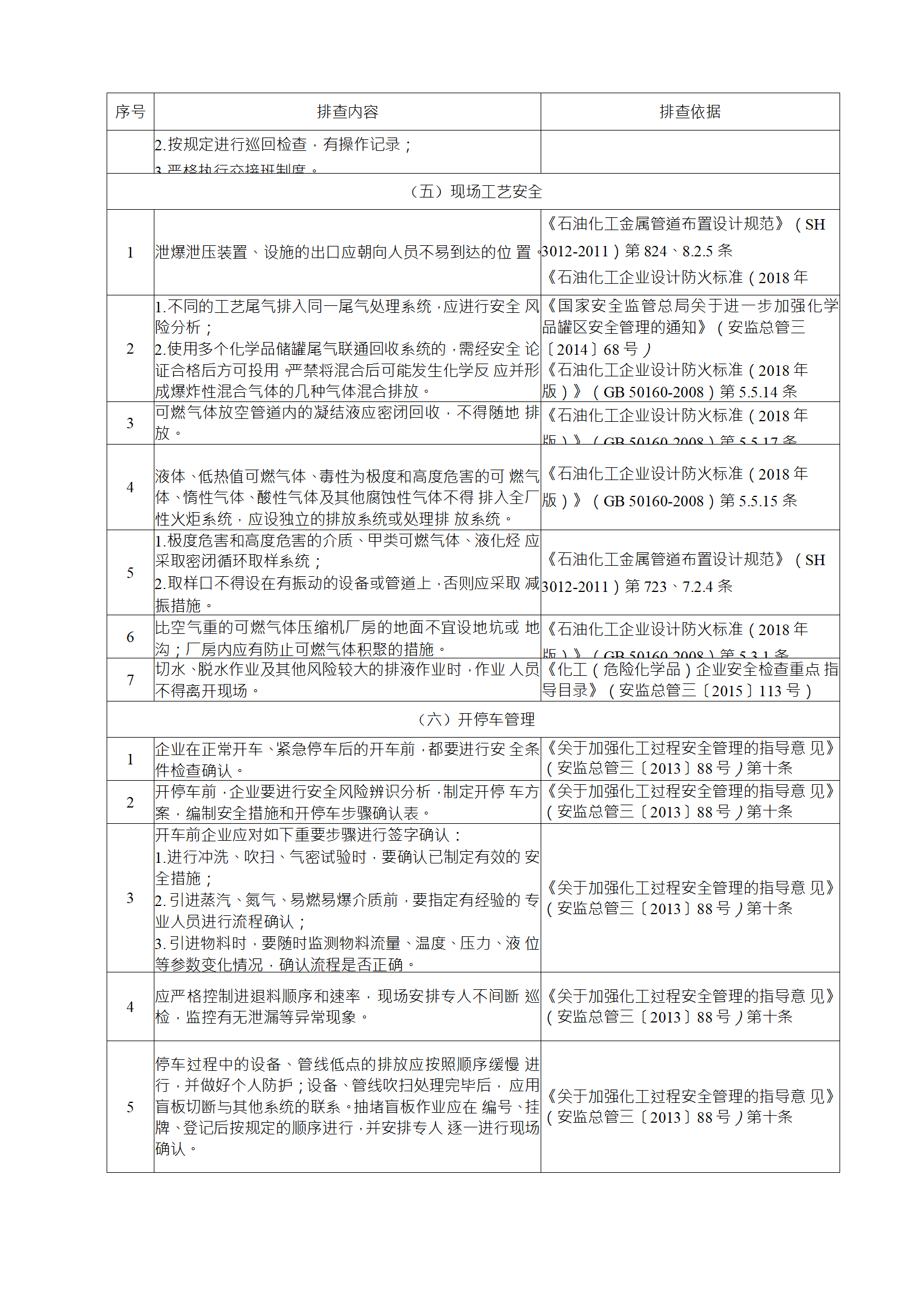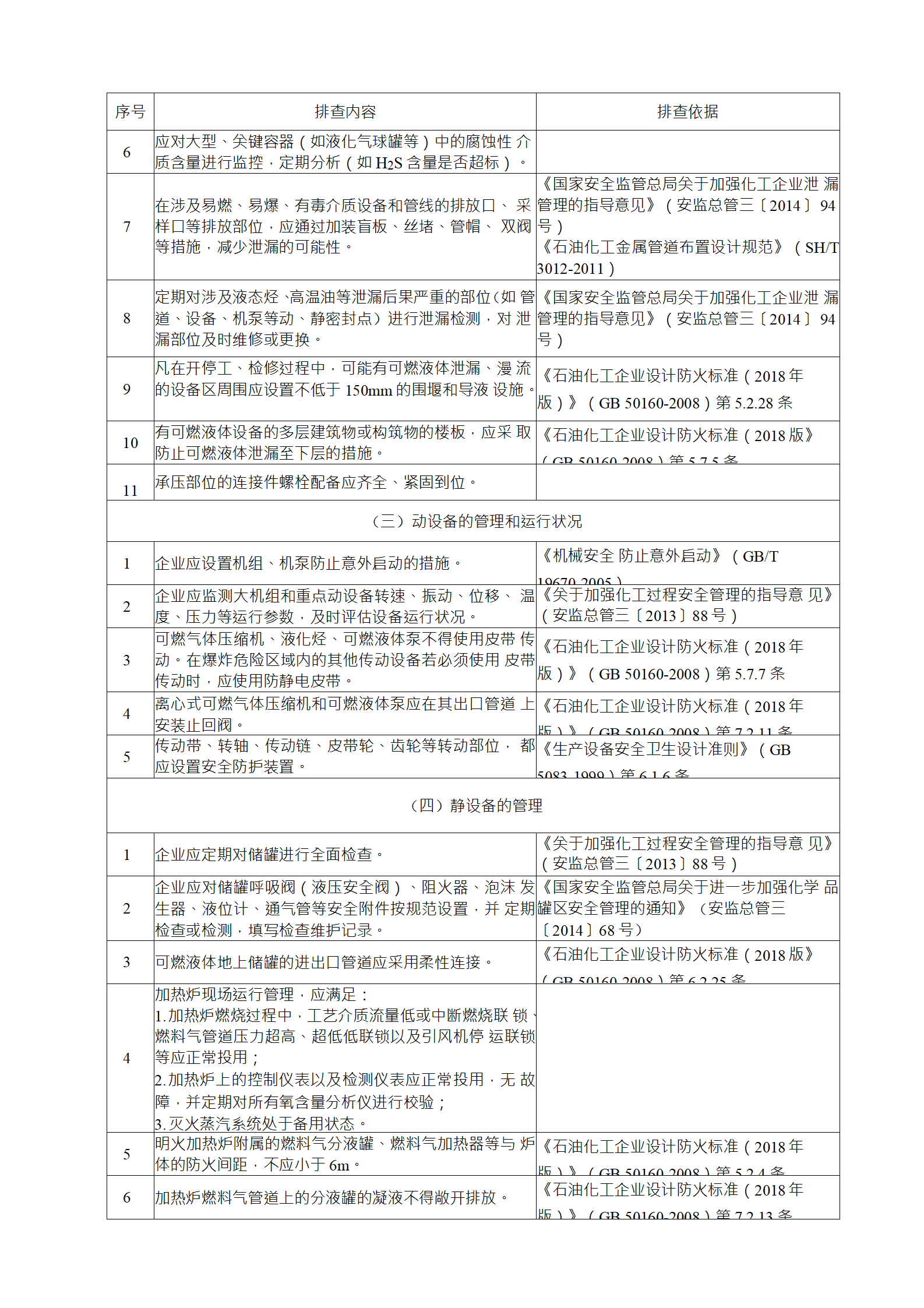 企業(yè)應結合自身安全風險及管控水平,按照化工過程安全 管理的要求,參照各專業(yè)安全風險隱患排查表(見附件),編制 符合自身實際的安全風險隱患排查表,開展安全風險隱患排查 工作。