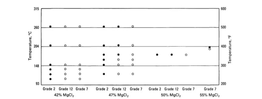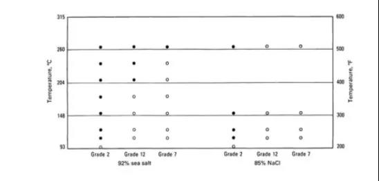注意:圖中白色圓圈代表可以使用;黑色圓圈代表容易發(fā)生縫隙腐蝕或點蝕;白色三角形代表發(fā)生輕微的縫隙腐蝕,但是不影響使用。