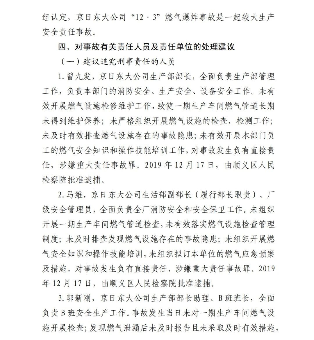 2.馬維,京日東大公司生活部副部長(zhǎng)(履行部長(zhǎng)職責(zé))、廠級(jí)安全管理員,全面負(fù)責(zé)全廠消防安全和安全保衛(wèi)工作。未組織開(kāi)展一期生產(chǎn)車(chē)間燃?xì)夤艿罊z查,未有效落實(shí)燃?xì)庠O(shè)施檢查管理制度;未及時(shí)排查發(fā)現(xiàn)燃?xì)庠O(shè)施存在的事故隱患;未組織開(kāi)展燃?xì)獍踩R(shí)和操作技能培訓(xùn),未組織擬訂本單位的燃?xì)鈶?yīng)急預(yù)案及措施,對(duì)事故發(fā)生負(fù)有直接責(zé)任,涉嫌重大責(zé)任事故罪。2019 年 12 月 17 日,由順義區(qū)人民檢察院批準(zhǔn)逮捕。