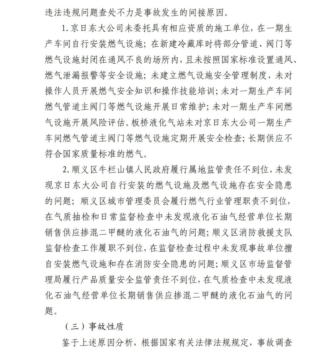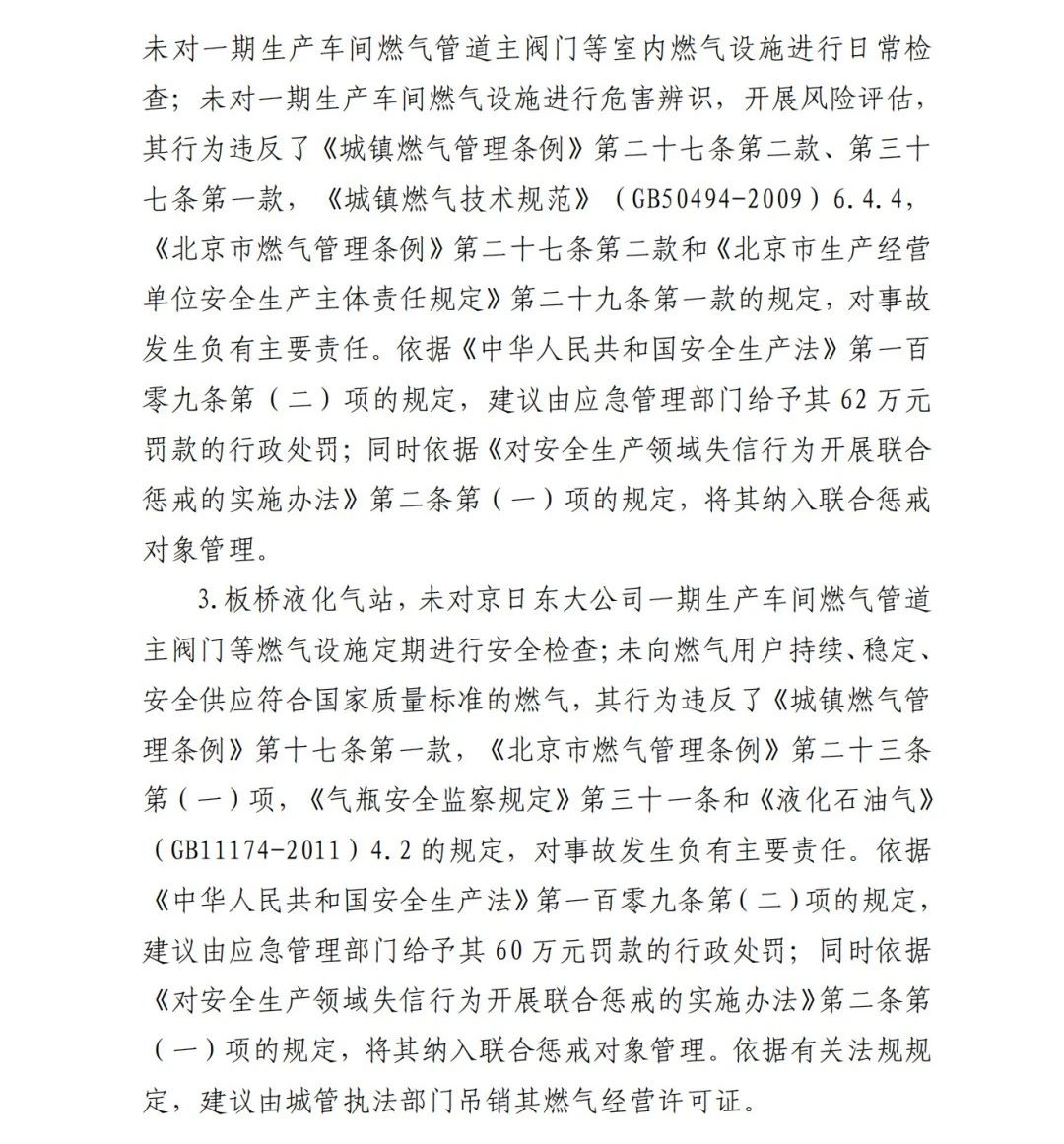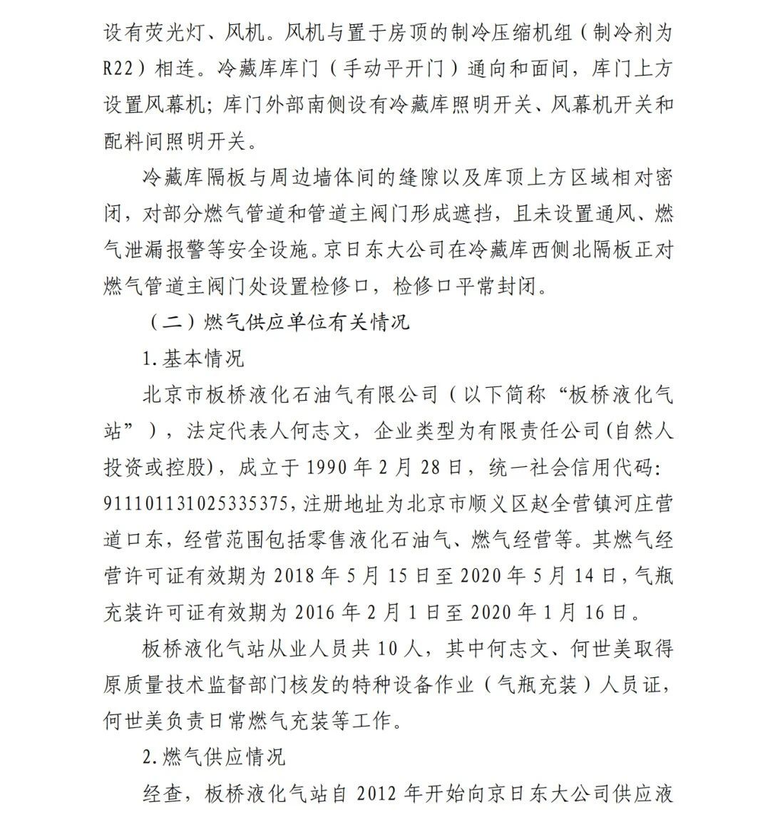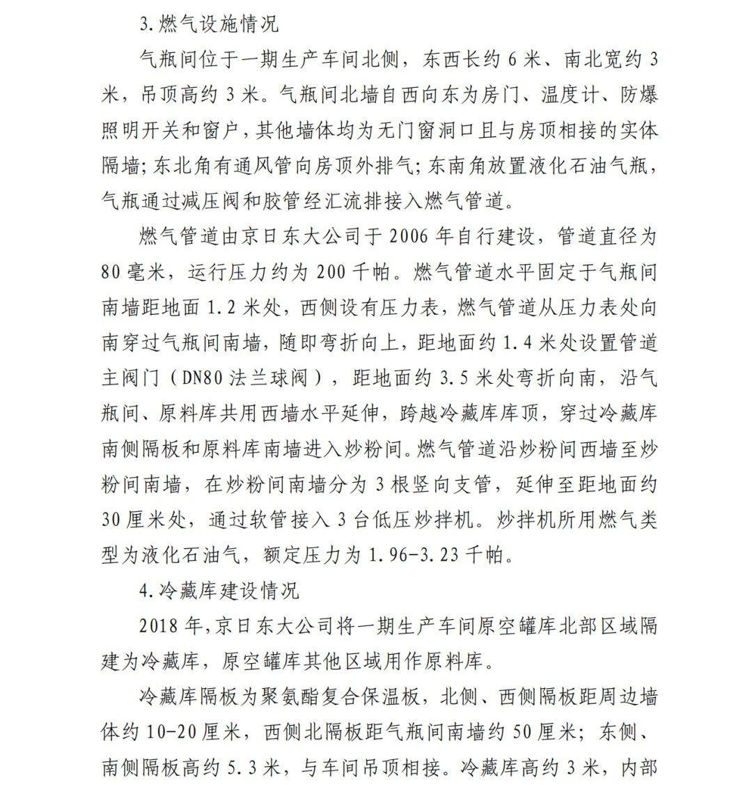 事故調(diào)查報(bào)告顯示:方勇忠2006年負(fù)責(zé)京日東大公司一期生產(chǎn)車(chē)間建設(shè)工作,期間未委托具有相應(yīng)資質(zhì)的施工單位,而組織本單位人員自行建設(shè)安裝燃?xì)庠O(shè)施,導(dǎo)致燃?xì)庠O(shè)施安全隱患長(zhǎng)期存在。另外,方勇忠2018年負(fù)責(zé)一期生產(chǎn)車(chē)間內(nèi)新建冷藏庫(kù)建設(shè),將部分管道、閥門(mén)等燃?xì)庠O(shè)施封閉在通風(fēng)不良的場(chǎng)所內(nèi),且未設(shè)置通風(fēng)、燃?xì)庑孤﹫?bào)警等安全設(shè)施,因而對(duì)事故發(fā)生負(fù)有直接責(zé)任。