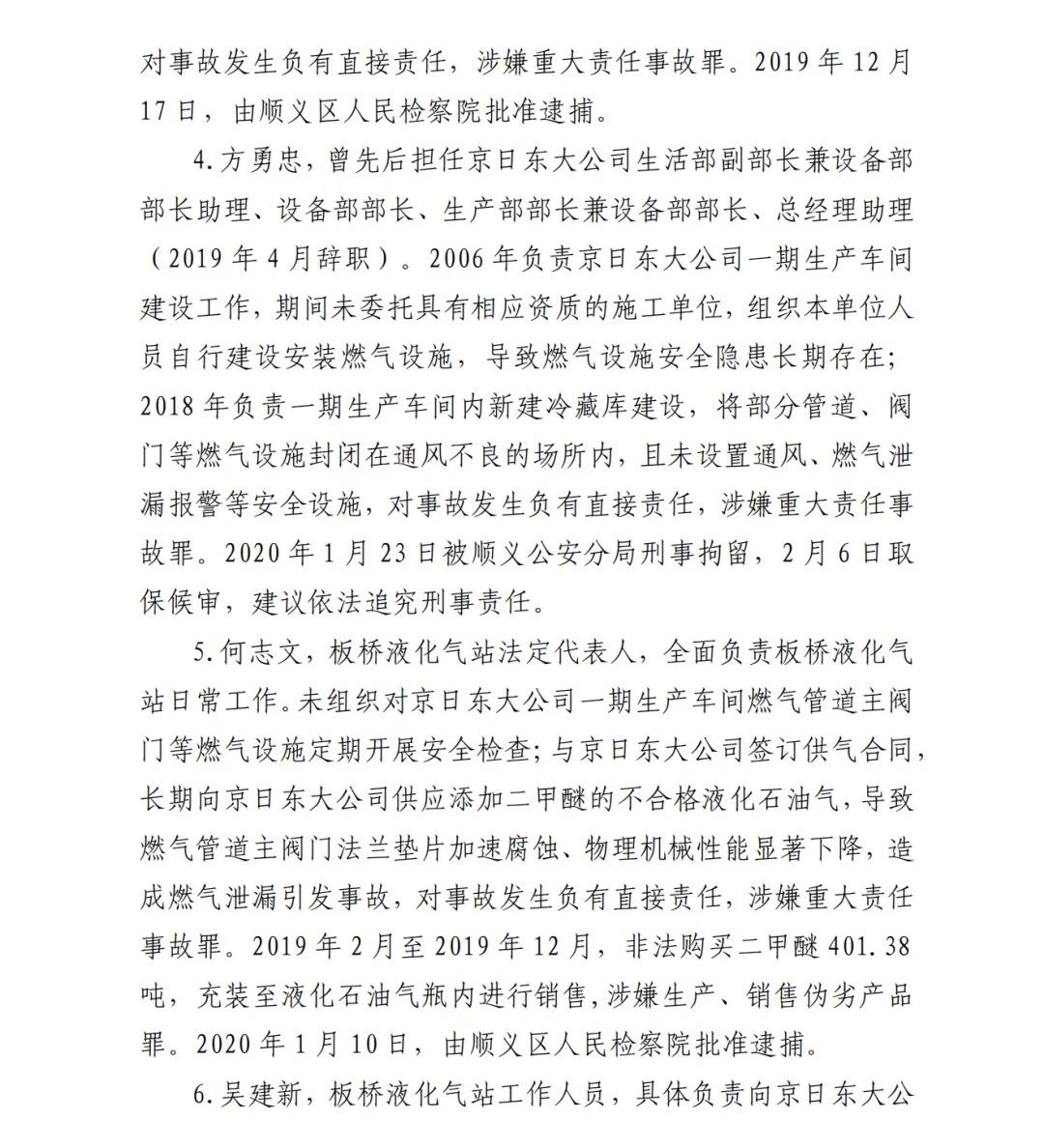 5.何志文,板橋液化氣站法定代表人,全面負(fù)責(zé)板橋液化氣站日常工作。未組織對(duì)京日東大公司一期生產(chǎn)車(chē)間燃?xì)夤艿乐鏖y門(mén)等燃?xì)庠O(shè)施定期開(kāi)展安全檢查;與京日東大公司簽訂供氣合同,長(zhǎng)期向京日東大公司供應(yīng)添加二甲醚的不合格液化石油氣,導(dǎo)致燃?xì)夤艿乐鏖y門(mén)法蘭墊片加速腐蝕、物理機(jī)械性能顯著下降,造 成燃?xì)庑孤┮l(fā)事故,對(duì)事故發(fā)生負(fù)有直接責(zé)任,涉嫌重大責(zé)任事故罪。2019 年 2 月至 2019 年 12 月,非法購(gòu)買(mǎi)二甲醚 401.38 噸,充裝至液化石油氣瓶?jī)?nèi)進(jìn)行銷(xiāo)售,涉嫌生產(chǎn)、銷(xiāo)售偽劣產(chǎn)品 罪。2020 年 1 月 10 日,由順義區(qū)人民檢察院批準(zhǔn)逮捕。