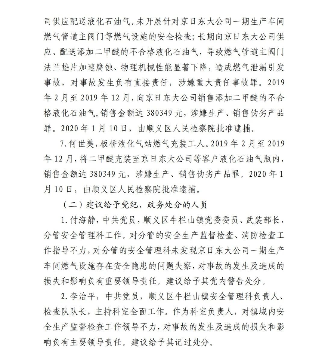 6.吳建新,板橋液化氣站工作人員,具體負(fù)責(zé)向京日東大公15司供應(yīng)配送液化石油氣。未開(kāi)展針對(duì)京日東大公司一期生產(chǎn)車(chē)間燃?xì)夤艿乐鏖y門(mén)等燃?xì)庠O(shè)施的安全檢查;長(zhǎng)期向京日東大公司供應(yīng)、配送添加二甲醚的不合格液化石油氣,導(dǎo)致燃?xì)夤艿乐鏖y門(mén)法蘭墊片加速腐蝕、物理機(jī)械性能顯著下降,造成燃?xì)庑孤┮l(fā) 事故,對(duì)事故發(fā)生負(fù)有直接責(zé)任,涉嫌重大責(zé)任事故罪。2019 年 2 月至 2019 年 12 月,向京日東大公司銷(xiāo)售添加二甲醚的不合 格液化石油氣,銷(xiāo)售金額達(dá) 380349 元,涉嫌生產(chǎn)、銷(xiāo)售偽劣產(chǎn)品 罪。2020 年 1 月 10 日,由順義區(qū)人民檢察院批準(zhǔn)逮捕。