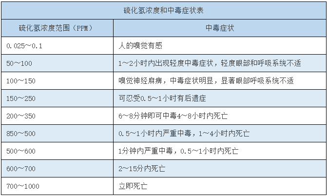 硫化氫能夠直接妨礙肌體對氧的攝取和運輸。從而造成細胞內(nèi)呼吸酶失去活力,造成細胞缺氧窒息死亡,硫化氫的毒性很強,人的絕對致死濃度為1000毫克/米3。當空氣中的硫化氫濃度為10~15ppm時使人們出現(xiàn)中毒癥狀,我國的工作場地環(huán)境最大允許濃度為10ppm