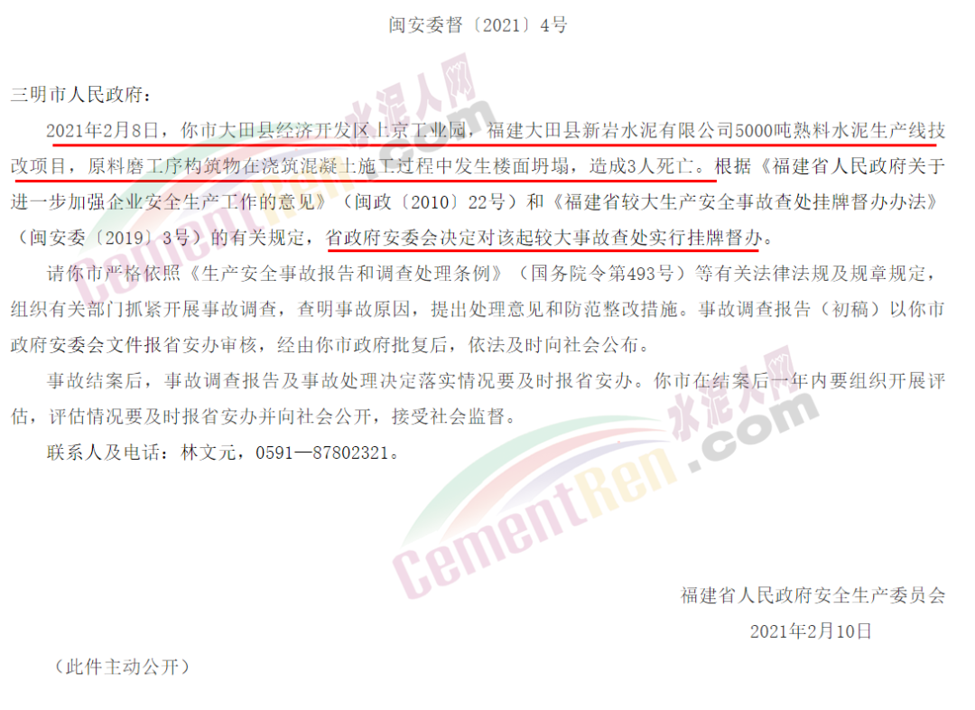 據(jù)水泥人網(wǎng)了解,福建省應(yīng)急管理廳發(fā)布較大生產(chǎn)安全事故查處掛牌督辦通知書(三明大田2.8水泥技改項(xiàng)目施工過程樓面坍塌事故)稱,2021年2月8日,三明市大田縣經(jīng)濟(jì)開發(fā)區(qū)上京工業(yè)園,福建大田縣新巖水泥有限公司5000噸熟料水泥生產(chǎn)線技改項(xiàng)目,原料磨工序構(gòu)筑物在澆筑混凝土施工過程中發(fā)生樓面坍塌,造成3人死亡。 依據(jù)有關(guān)規(guī)定,福建省政府安委會(huì)決定對(duì)該起較大事故查處實(shí)行掛牌督辦。