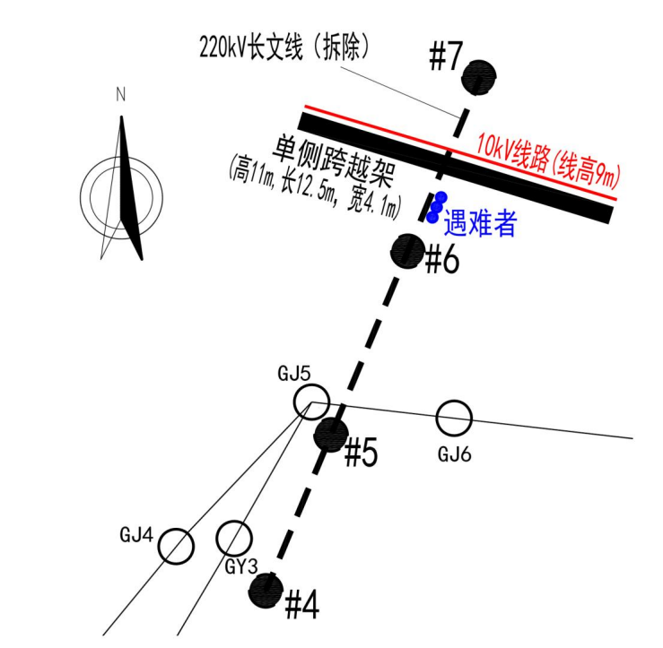 16時(shí)許,楊某某在6-7號(hào)桿塔間10千伏夏屯線北側(cè)剪斷南北走向的原 220 千伏長(zhǎng)文線架空導(dǎo)線后,使用繩子拴住第一、二股導(dǎo)線后在樹上高處進(jìn)行牽引,由王某某、李某某、倪某某3人拉拽到10千伏夏屯線跨越架南側(cè)地面。