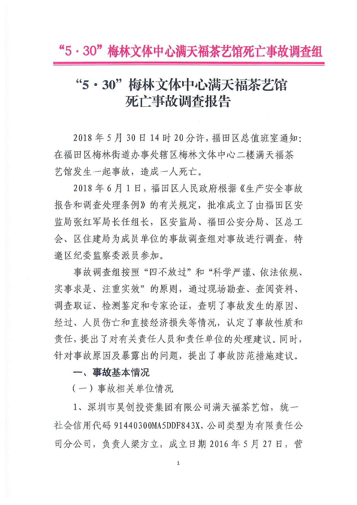 “5.30”梅林文體中心滿天福茶藝館死亡事故調(diào)查報告