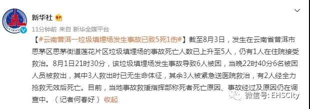 【#云南普洱一垃圾填埋場發(fā)生事故已致5死1傷#】截至8月3日,發(fā)生在云南省普洱市思茅區(qū)思茅街道蓮花片區(qū)垃圾填埋場的事故死亡人數(shù)已上升至5人,仍有1人在住院接受救治。8月1日21時(shí)30分,該垃圾填埋場發(fā)生事故導(dǎo)致6人被困,當(dāng)晚22時(shí)40分6名被困人員被救出,其中3人救出時(shí)已無生命體征,其余3人被緊急送醫(yī)院救治,有2人經(jīng)全力搶救無效后死亡。目前,當(dāng)?shù)厥鹿示仍笓]部稱死者死亡原因、事故經(jīng)過及原因仍在調(diào)查中。(記者何春好)極目新聞記者梳理發(fā)現(xiàn),普洱市中心城區(qū)生活垃圾焚燒發(fā)電廠建設(shè)項(xiàng)目,為思茅區(qū)2019年23項(xiàng)重點(diǎn)工作之一,于2019年啟動建設(shè),并優(yōu)先完成填埋區(qū)建設(shè)。2020年,普洱市相關(guān)領(lǐng)導(dǎo)曾前往思茅區(qū),實(shí)地調(diào)研市中心城區(qū)生活垃圾焚燒發(fā)電廠項(xiàng)目推進(jìn)工作。公開資料顯示,2020年3月,配套填埋場正式投入使用,填埋場類型為填埋生活垃圾的衛(wèi)生填埋場,庫容為30.1萬立方。