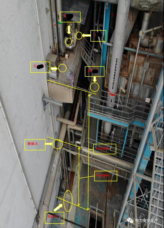 4.現(xiàn)場核查,主給水放水管已完全斷裂,下部水泥平臺(tái)被擊穿,臨近的滑動(dòng)支架被高壓水汽吹脫至靠汽機(jī)房墻面,注膠槍與夾具脫開,吹至靠汽機(jī)房墻面。給水平臺(tái)頂端下部懸空冷再供熱母管保溫外護(hù)板有明顯碰撞變形痕跡,和余某某事故中躲避位置、事故后墜落位置對(duì)應(yīng)。