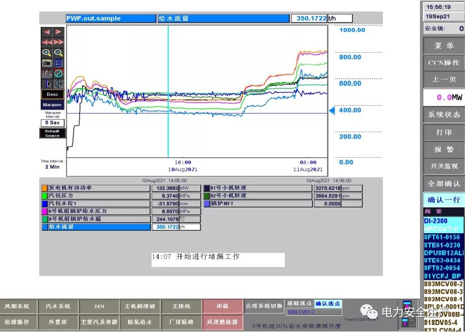 15:22 分,鍋爐給煤量由204t/h 減至 49t/h,汽包水位由-32mm快速降至-188mm。