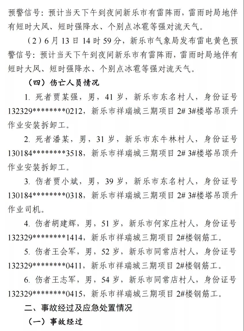 2021年6月13日下午15:50左右,河北石家莊新樂市祥瑞城建筑工地在塔吊頂升作業(yè)過程中,遇強(qiáng)對流雷雨天氣,伴有短時(shí)強(qiáng)風(fēng)和強(qiáng)降水,發(fā)生意外,2名工人不幸墜亡,4名工人受傷。