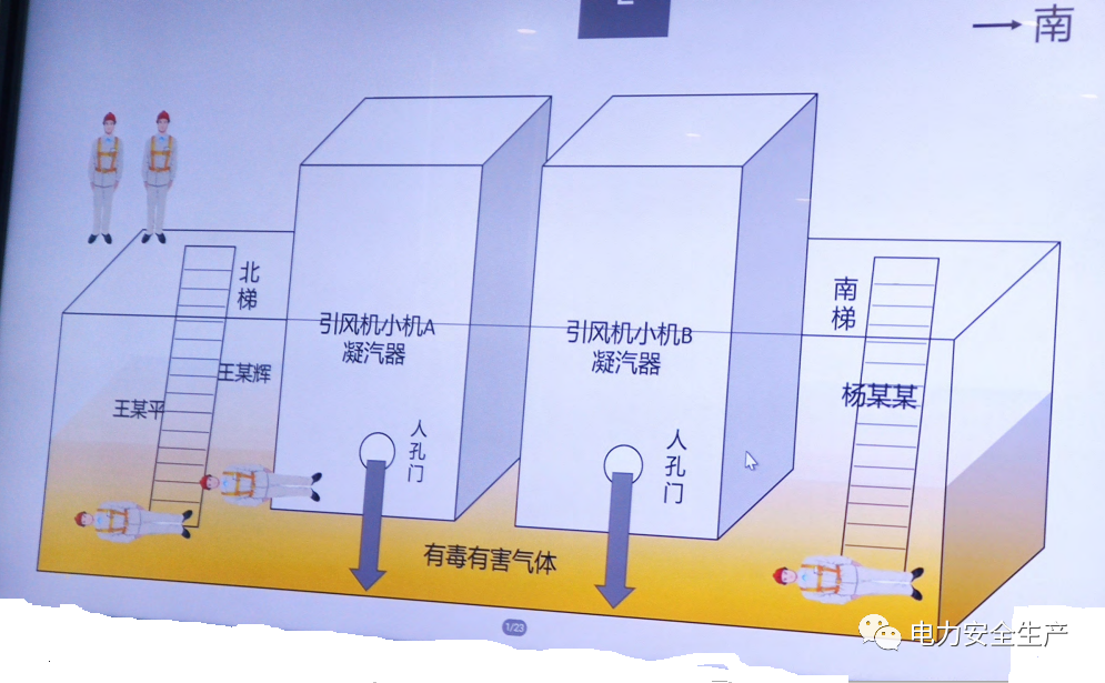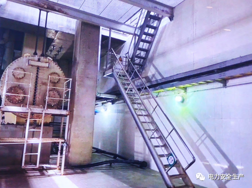 15:40安潔公司楊某某等4名作業(yè)人員,從#4機(jī)組汽動引風(fēng)機(jī)室北側(cè)鋼步梯依次走下凝汽器區(qū)域準(zhǔn)備清理垃圾及取回相關(guān)工具,走在前面的王某某、王某某在下樓梯半途中暈倒并滑落至樓梯底部,走在后面的楊某某、王某某發(fā)現(xiàn)情況異常,隨即退至汽動引風(fēng)機(jī)室外,并電話報告檢修部鄭某某。