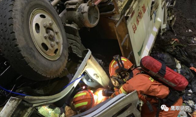 首批消防救援人員趕到現(xiàn)場(chǎng)了解得知,垃圾庫(kù)長(zhǎng) 48 米、寬 20 米,總深度為 23 米,車輛從卸料平臺(tái)跌落至 12 米處的垃圾斜坡地段,呈車頂朝下、車底盤(pán)朝上倒翻狀態(tài),而且處于在垃圾坡度為 40 度左右的大斜坡上,隨時(shí)有更一步往下翻車至浸水區(qū)的危險(xiǎn)?,F(xiàn)場(chǎng)指揮員通過(guò)前期勘查,咨詢現(xiàn)場(chǎng)工作人員垃圾廢料區(qū)有無(wú)致命氣體危險(xiǎn)等相關(guān)情況后,迅速命令 4 名救援人員佩戴空氣呼吸器,攜帶破拆工具、有毒氣體探測(cè)儀、多功能救援擔(dān)架等救援設(shè)備利用軟梯、繩索下到事故救援點(diǎn)。由于車輛嚴(yán)重變形,導(dǎo)致救援操作困難被困者一時(shí)無(wú)法移出。