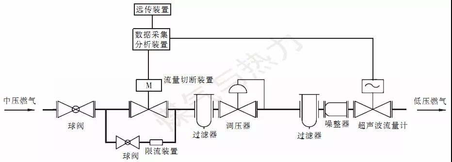 由于突發(fā)事故導(dǎo)致管道破損出現(xiàn)大量燃?xì)庑孤┖蟮陌l(fā)現(xiàn)、響應(yīng)及處理時(shí)間十分關(guān)鍵,快速辨別管道漏氣,第一時(shí)間進(jìn)行處置(如切斷上游供氣),可有效降低發(fā)生爆燃事故的風(fēng)險(xiǎn),尤其對(duì)于人口密集區(qū)域的庭院燃?xì)夤艿朗鹿侍幚砀又匾1卷?xiàng)目從管道出現(xiàn)較大泄漏產(chǎn)生流量異常作為切入點(diǎn)[1],重點(diǎn)研究解決兩個(gè)問題:第一是對(duì)泄漏的智能判斷,通過對(duì)埋地庭院管網(wǎng)流量異常變化的捕捉及辨識(shí),對(duì)管道泄漏進(jìn)行辨識(shí)。第二是實(shí)時(shí)性問題,及時(shí)發(fā)現(xiàn)泄漏后,快速報(bào)警、處置,縮短響應(yīng)時(shí)間。本項(xiàng)目考慮在燃?xì)庵械蛪和ピ喝細(xì)夤艿勒{(diào)壓箱處,安裝庭院燃?xì)夤艿佬孤﹫?bào)警切斷裝置解決上述問題。該裝置主要由數(shù)據(jù)采集分析裝置、流量切斷裝置、遠(yuǎn)傳裝置、超聲波流量計(jì)、限流裝置以及球閥、過濾器、噪整器、太陽能電池系統(tǒng)等組成,見圖1,太陽能電池系統(tǒng)未畫于圖1內(nèi),其主要承擔(dān)數(shù)據(jù)采集分析裝置、遠(yuǎn)傳裝置運(yùn)行供電以及模塊間的通信供電。圖1 庭院燃?xì)夤艿佬孤﹫?bào)警切斷(限流)裝置組成
