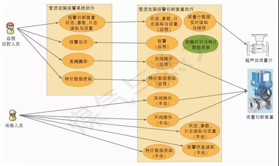 本系統(tǒng)選擇日本愛知AS超聲波流量計(jì),為速度式流量計(jì)。其使用壓力小于等于1.0 MPa,防爆防護(hù)等級(jí)為EX ib IIB T4 Gb IP65,數(shù)據(jù)通信協(xié)議為RS485 MODBUS/RTU,精度等級(jí)為1.0級(jí)。超聲波流量計(jì)相較于其他類型流量計(jì)(如渦輪流量計(jì)),由于無轉(zhuǎn)動(dòng)組件,不受慣性影響,對(duì)瞬時(shí)流量變化的靈敏度更高,且流量范圍較廣,始動(dòng)流量較小,例如DN 50 mm口徑的超聲波流量計(jì)始動(dòng)流量為0.37 m3/h,DN 100 mm口徑的超聲波流量計(jì)始動(dòng)流量為1.25 m3/h。對(duì)小流量感知更靈敏,用于管網(wǎng)瞬時(shí)流量的監(jiān)測與捕捉,比較適合[5]。本系統(tǒng)選擇的遠(yuǎn)傳裝置為山東思達(dá)特ST2000模塊,其負(fù)責(zé)太陽能電池系統(tǒng)供電管理和與燃?xì)夤镜谋O(jiān)測平臺(tái)系統(tǒng)遠(yuǎn)程通信。遠(yuǎn)傳裝置采用RS485直讀方式從數(shù)據(jù)采集分析裝置獲取數(shù)據(jù),通過GPRS/CDMA無線通信進(jìn)行遠(yuǎn)傳,發(fā)送流量數(shù)據(jù)與報(bào)警信息,接收監(jiān)測平臺(tái)系統(tǒng)的指令,并下達(dá)到數(shù)據(jù)采集分析裝置。數(shù)據(jù)采集分析裝置與流量計(jì)、遠(yuǎn)傳裝置、太陽能電池系統(tǒng)等連接。超聲波流量計(jì)自帶電池可單獨(dú)運(yùn)行。整套供電系統(tǒng)可以正常運(yùn)行6 a以上。 為實(shí)現(xiàn)流量監(jiān)測、泄漏識(shí)別、報(bào)警遠(yuǎn)傳、遠(yuǎn)程切斷等功能,系統(tǒng)軟件主要由本地管道泄漏報(bào)警切斷裝置軟件和遠(yuǎn)端管道泄漏報(bào)警系統(tǒng)軟件兩部分組成。系統(tǒng)用例圖(軟件開發(fā)用于系統(tǒng)業(yè)務(wù)功能需求分析、系統(tǒng)建模的示意圖)見圖3,參與者包括:管道泄漏報(bào)警切斷裝置軟件、超聲波流量計(jì)、流量切斷裝置、管道泄漏報(bào)警系統(tǒng)軟件、遠(yuǎn)程監(jiān)控人員、現(xiàn)場人員。其中,管道泄漏報(bào)警系統(tǒng)可以是其他的SCADA平臺(tái)系統(tǒng),這里只是為完成遠(yuǎn)程泄漏監(jiān)測、報(bào)警、遠(yuǎn)程切斷、參數(shù)設(shè)置等功能,所列舉的功能模塊。本文主要探討本地管道泄漏報(bào)警切斷裝置軟件的設(shè)計(jì),即數(shù)據(jù)采集分析裝置主板的內(nèi)置程序,配合遠(yuǎn)傳裝置實(shí)現(xiàn)相關(guān)功能。由圖3可知,管道泄漏報(bào)警切斷裝置軟件設(shè)計(jì)包括泄漏識(shí)別與特征數(shù)據(jù)更新,流量計(jì)數(shù)據(jù)實(shí)時(shí)讀取與儲(chǔ)存,狀態(tài)、參數(shù)、日志讀取與設(shè)置(遠(yuǎn)程發(fā)送與本地操作),報(bào)警(遠(yuǎn)程發(fā)送),關(guān)閥操作(遠(yuǎn)程操作),特征數(shù)據(jù)獲?。ㄟh(yuǎn)程發(fā)送與本地操作),報(bào)警信息讀?。ū镜夭僮鳎?,開關(guān)閥操作(本地操作)等程序功能組成。遠(yuǎn)程監(jiān)控人員通過SCADA系統(tǒng)進(jìn)行遠(yuǎn)程交互操作?,F(xiàn)場人員通過數(shù)據(jù)采集分析裝置按鍵、顯示屏、SD卡進(jìn)行本地交互操作[6]。