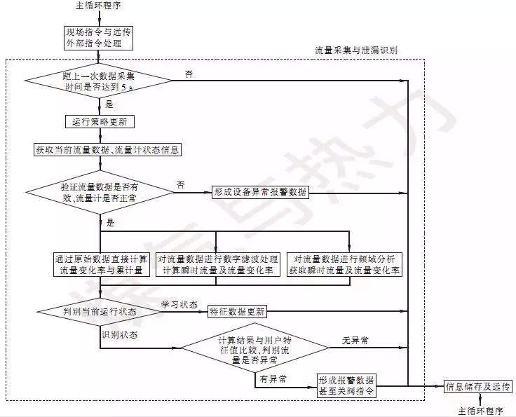 為實(shí)現(xiàn)上述功能,本地管道泄漏報(bào)警切斷裝置軟件程序邏輯架構(gòu)由基礎(chǔ)層、技術(shù)服務(wù)層、應(yīng)用層3層組成?;A(chǔ)層包含各硬件操作的底層驅(qū)動(dòng)程序,如數(shù)據(jù)采集分析裝置與流量計(jì)、遠(yuǎn)傳裝置的RS485串口通信,SD卡數(shù)據(jù)的讀取與儲(chǔ)存,按鍵操作讀取等模塊。技術(shù)服務(wù)層為實(shí)現(xiàn)系統(tǒng)功能邏輯,提供相關(guān)的工具組件,調(diào)用基礎(chǔ)層的驅(qū)動(dòng)程序接口,對(duì)數(shù)據(jù)進(jìn)行解釋、加工處理,并向應(yīng)用層提供數(shù)據(jù)服務(wù)接口,方便功能邏輯的調(diào)用,包括開關(guān)閥指令處理、流量計(jì)數(shù)據(jù)采集與儲(chǔ)存、報(bào)警信息發(fā)送、報(bào)警數(shù)據(jù)儲(chǔ)存與讀取、參數(shù)信息儲(chǔ)存與讀取、數(shù)據(jù)的本地顯示、數(shù)據(jù)頻譜分析工具、時(shí)鐘校對(duì)等模塊。應(yīng)用層實(shí)現(xiàn)系統(tǒng)的邏輯功能,通過主循環(huán)程序周期循環(huán)調(diào)用流量采集與泄漏識(shí)別模塊、現(xiàn)場按鍵指令處理模塊、遠(yuǎn)傳外部指令處理模塊,實(shí)現(xiàn)系統(tǒng)的自動(dòng)運(yùn)行與對(duì)外交互。主循環(huán)程序運(yùn)行流量采集與泄漏識(shí)別模塊的程序流程見圖4。該部分為系統(tǒng)的核心功能之一,通過定時(shí)中斷程序?qū)崿F(xiàn)循環(huán)運(yùn)行。進(jìn)入主程序模塊后,首先判斷流量采集周期是否滿足,即當(dāng)前時(shí)間距上一次流量采集時(shí)間是否滿足采集間隔(5 s),如果否,則跳出本次流量采集與泄漏識(shí)別操作;如果是,則執(zhí)行泄漏識(shí)別運(yùn)行策略更新程序,檢查識(shí)別參數(shù)、指令是否有修改,并進(jìn)行數(shù)據(jù)更新。從流量計(jì)獲取實(shí)時(shí)流量原始數(shù)據(jù)與狀態(tài)信息,檢查數(shù)據(jù)的有效性,例如報(bào)文中是否有報(bào)警或錯(cuò)誤數(shù)據(jù),檢查流量計(jì)狀態(tài)是否正常。如果數(shù)據(jù)無效或流量計(jì)狀態(tài)不正常,則形成設(shè)備異常報(bào)警數(shù)據(jù),執(zhí)行信息儲(chǔ)存、遠(yuǎn)傳。如果數(shù)據(jù)有效,則對(duì)數(shù)據(jù)進(jìn)行計(jì)算處理及識(shí)別分析。計(jì)算處理過程包括3種方式,3種方式均通過原始流量數(shù)據(jù)計(jì)算某時(shí)段的流量累計(jì)值。對(duì)于原始流量變化比較平穩(wěn)即系統(tǒng)不存在調(diào)壓器喘振導(dǎo)致的流量頻繁波動(dòng)時(shí),可通過原始流量數(shù)據(jù)直接計(jì)算獲取流量變化率,速度較快,實(shí)時(shí)性較強(qiáng)。如果調(diào)壓器喘振導(dǎo)致流量波動(dòng)干擾較大,則需要將喘振干擾部分濾掉后再進(jìn)行下一步計(jì)算分析,可以對(duì)流量數(shù)據(jù)進(jìn)行數(shù)字濾波處理或頻域分析處理,然后計(jì)算瞬時(shí)流量及流量變化率。數(shù)字濾波處理和頻域分析處理這兩種方法,去除干擾的原理不同,可以選擇其中一種方法,或兩者都使用,達(dá)到雙重保險(xiǎn)的目的。這兩種方法實(shí)時(shí)性稍弱,但可有效降低喘振干擾造成的誤報(bào)。接下來判別當(dāng)前運(yùn)行狀態(tài),當(dāng)數(shù)據(jù)采集分析裝置用于管網(wǎng)用氣規(guī)律搜集即學(xué)習(xí)階段時(shí),程序不進(jìn)行泄漏識(shí)別操作,而是直接生成并儲(chǔ)存用戶特征數(shù)據(jù)。當(dāng)數(shù)據(jù)采集分析裝置用于管網(wǎng)泄漏監(jiān)測識(shí)別時(shí),程序?qū)?dāng)前計(jì)算結(jié)果與用戶特征值進(jìn)行比較,判別流量是否異常,當(dāng)有異常時(shí),形成報(bào)警數(shù)據(jù)甚至關(guān)閥指令,之后執(zhí)行信息儲(chǔ)存、遠(yuǎn)傳等后續(xù)主程序指令,完成一次循環(huán)。