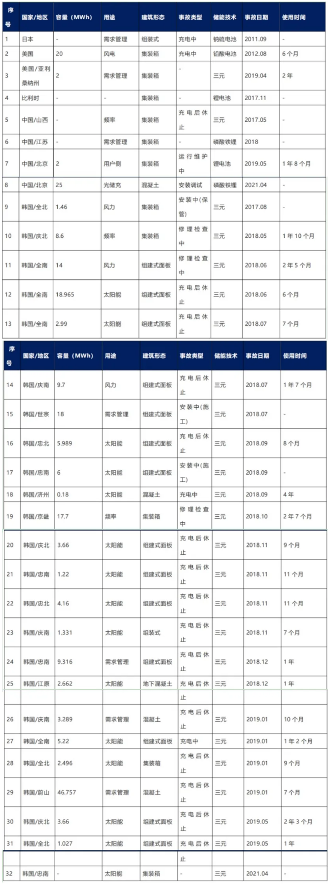 近10年間,全球共發(fā)生32起儲能電站起火爆炸事故。其中,日本1起、美國2起、比利時1起、中國3起、韓國24起。通過對行業(yè)公開信息進行搜集整理,匯總了2011-2021年間,全球儲能項目主要火災(zāi)或爆炸事故。由于較多安全事故原因復(fù)雜,相關(guān)事件很多都未公開披露。