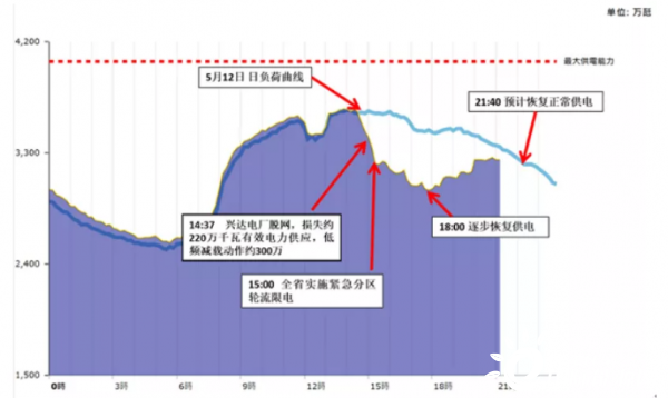 5月13日14時(shí)37分,興達(dá)電廠(chǎng)因接入345千伏路北變電站母線(xiàn)故障,導(dǎo)致電廠(chǎng)電力送出受阻,兩臺(tái)燃煤及兩臺(tái)燃?xì)鈾C(jī)組脫網(wǎng),系統(tǒng)損失有效電力供應(yīng)約220萬(wàn)千瓦,造成臺(tái)灣系統(tǒng)頻率驟降,為維持電網(wǎng)穩(wěn)定,電力系統(tǒng)在第一時(shí)間自動(dòng)啟動(dòng)低頻卸載約300萬(wàn)千瓦。臺(tái)電評(píng)估短時(shí)間內(nèi)無(wú)法立即復(fù)電,為維系電力系統(tǒng)安全,自下午3時(shí)起執(zhí)行緊急分區(qū)輪流停電,最大限電達(dá)到350萬(wàn)千瓦。事故過(guò)程系統(tǒng)負(fù)荷變化曲線(xiàn)下圖所示。