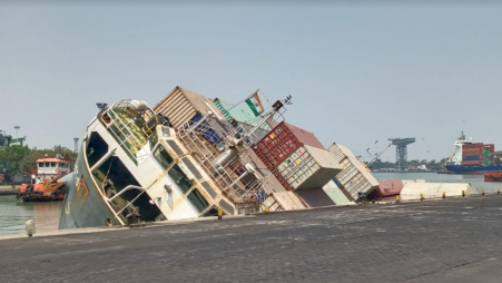 加爾各答港口官員報告說,這艘船于3月22日從印度薩加爾港抵達加爾各答,在3月24日上午剛剛完成裝載,總共裝載了165 個集裝箱,包括120個 20 英尺集裝箱和45 個 40英尺集裝箱。該船原定于今天啟程前往孟加拉國吉大港,然而突然在沒有任何征兆的情況下發(fā)生傾斜,并在15分鐘內(nèi)側(cè)翻和部分沉沒,導(dǎo)致集裝箱掉入港口。