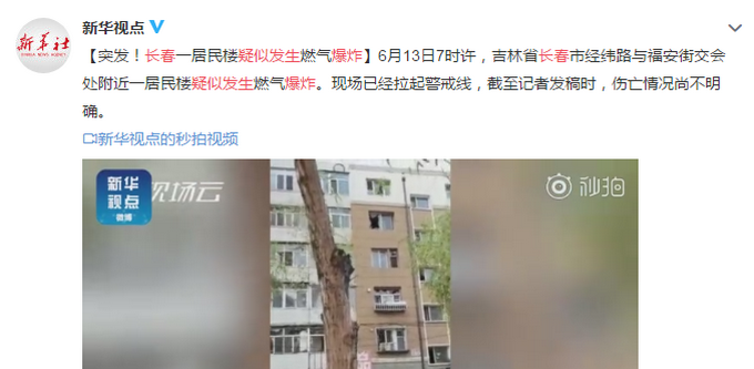 6月13日7時(shí)許,吉林省長春市經(jīng)緯路與福安街交會(huì)處附近一居民樓疑似發(fā)生燃?xì)獗ā?/span>