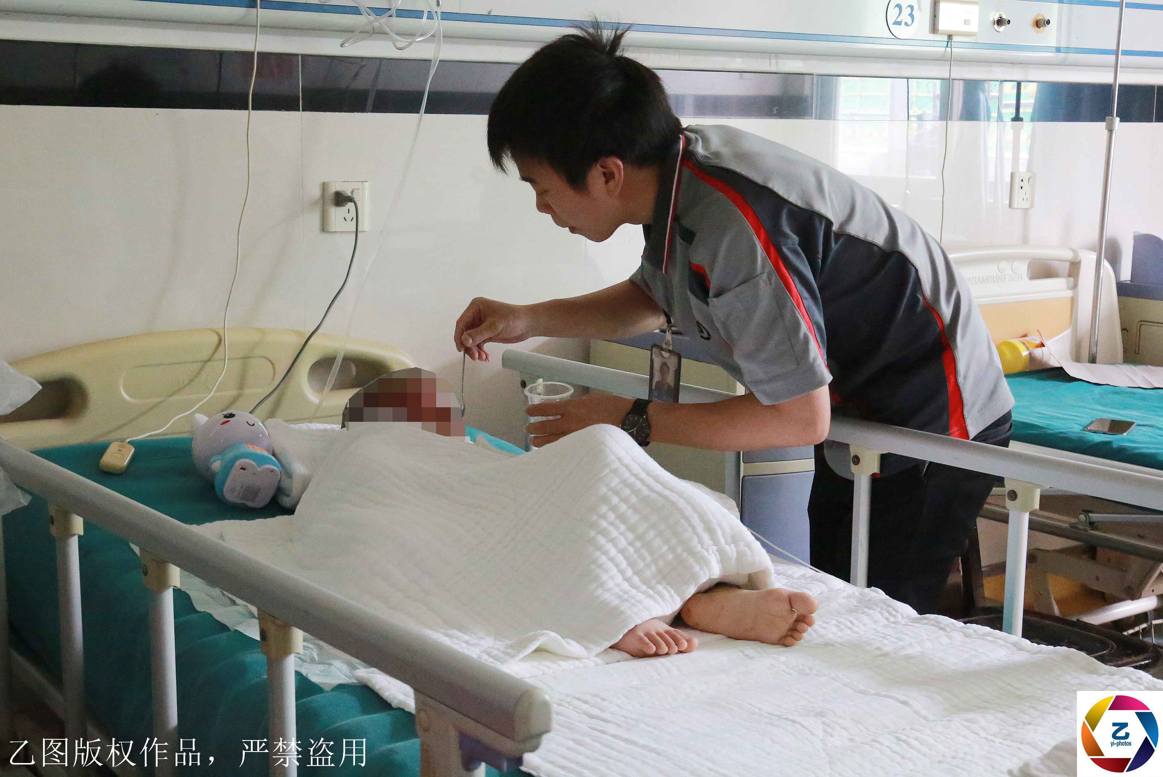 事發(fā)后,黎明將哥哥和侄兒的骨灰送回老家安葬,當(dāng)他處理完后事回到醫(yī)院時,醫(yī)院里再也沒有看到小俊逸母親李喜利的身影。他曾聯(lián)系了警方幫忙查找孩子的母親,希望她能夠回來照顧孩子,但是最終還是沒有結(jié)果。黎明想不明白,夫妻兩個離婚,孩子是無辜的,現(xiàn)在哥哥和大侄兒沒了,孩子母親也消失了,就小俊逸一個人孤單地躺在醫(yī)院里。圖為叔叔黎明在給小俊逸喂吃的。