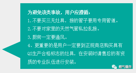2012年7月27日重慶奉節(jié)縣一居民家發(fā)生天然氣意外泄漏事故,發(fā)生事故的居民家中所有家具和電器都被燒毀,窗戶的玻璃已被震爛。爆炸造成一家6人燒傷,最終一人搶救無效死亡。據(jù)網(wǎng)上報道爆炸是由于天然氣管道與輸氣軟管之間存在縫隙,導(dǎo)致天然氣泄漏引發(fā)的。在該戶家中,發(fā)現(xiàn)新買的燃?xì)庠罹撸莻€三無產(chǎn)品。該戶的燃?xì)夤艿?,是由兩根軟管接起來的,一根軟管不夠長,中間還用一根硬塑料管連了起來,還使用了膠水來粘接,這是非常危險的作法,連接的塑料管是硬的,天然氣完全可能因連接處泄漏出來。也許是用戶點了火,也許只是開了某一種電器的開關(guān),就引起了天然氣爆炸,隨后的火焰擴(kuò)散,屋內(nèi)東西全部燒毀。