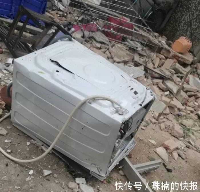 事發(fā)地點位于桃園小區(qū)34棟3梯2樓。記者在現(xiàn)場看到,2樓住宅西面及南面的墻壁被震塌,倒下的墻體砸中樓下一部小車。二樓門框和洗衣機等家具也掉到樓下,磚塊瓦礫、玻璃碎片灑落一地,現(xiàn)場一片狼藉,可見當時爆炸的威力十分巨大。