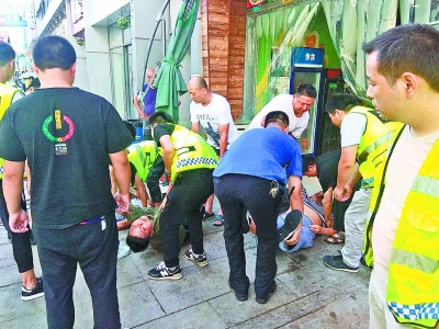 此時(shí),相鄰一家快餐店的老板娘雍女士正在倒垃圾,見狀趕緊喊來兩名伙計(jì),和城管隊(duì)員們一起將店內(nèi)的一名白衣女子和一名綠衣男子,抬到店外陰涼通風(fēng)處。雍女士用手指猛掐白衣女子的人中,但始終沒有反應(yīng)。