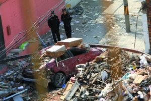 昨日,民*在爆炸現場進行調查。