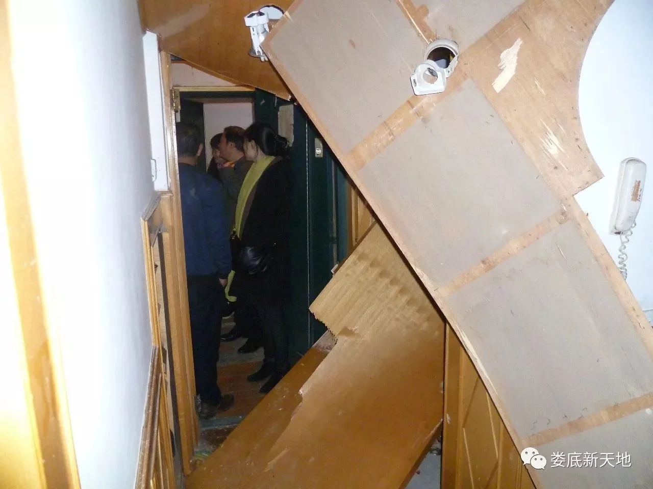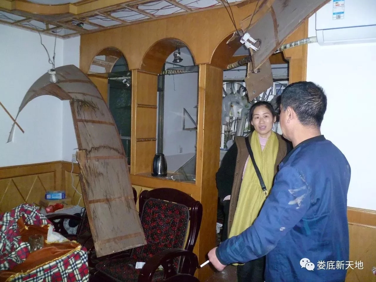 下午6時(shí),筆者走進(jìn)這套位于仙人閣的三室兩廳居室。只見(jiàn)防盜門(mén)活脫脫地被強(qiáng)大的氣浪沖開(kāi),里層的木門(mén)碎裂倒掉,客廳的天花板上也有好幾塊被毀。三個(gè)臥室、陽(yáng)臺(tái)、廚房的玻璃全部被震碎,碎玻璃撒了一地,滿(mǎn)地狼藉。臥室的柜子也被沖倒。