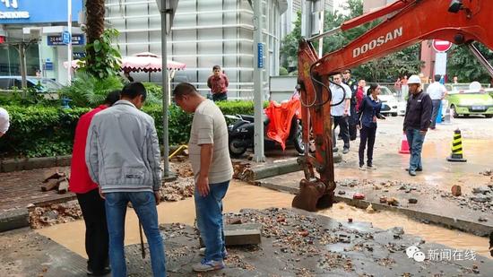 為了防止爆炸,消防部門(mén)在現(xiàn)場(chǎng)處置時(shí)使用了大量的水,而這些水積滿(mǎn)了現(xiàn)場(chǎng)開(kāi)挖的土溝,于是,施工方準(zhǔn)備利用窨井進(jìn)行排水,看到這種情況,現(xiàn)場(chǎng)搶修人員趕緊喊停。