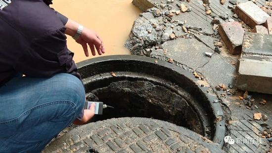 先不要敲,先不要敲,我們查一下濃度先,要不等一下(有)火花(發(fā)生)爆炸,這是雨水井啊,測(cè)一下濃度。這是雨水井,雨水井如果有氣進(jìn)去了同樣會(huì)爆炸,現(xiàn)在地下也是有,還是有是吧,等一下散了才能敲。