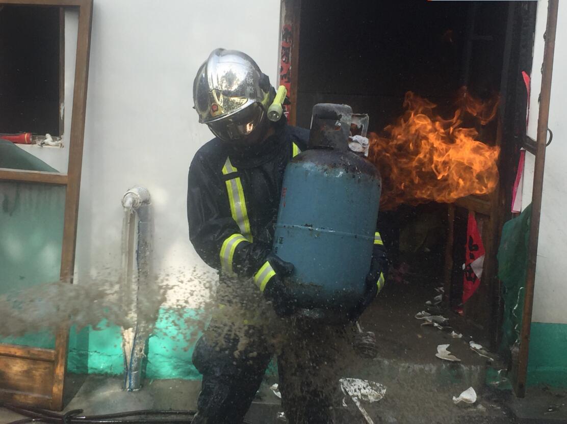 “當(dāng)時也有點害怕,煤氣罐閥門被燒壞了,如果不搬出來,在里面燃燒會更危險?!毕缿?zhàn)士武傳祥說。