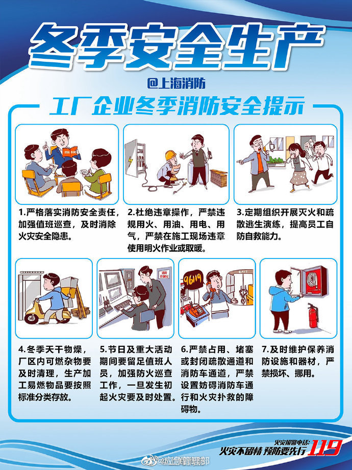 進(jìn)入冬季,工廠企業(yè)安全生產(chǎn)至關(guān)重要,各個(gè)生產(chǎn)單位切記做好檢查工作,防患于未然。加強(qiáng)值班巡查、嚴(yán)禁在施工現(xiàn)場違章使用明火作業(yè)或取暖、定期組織開展滅火和疏散逃生演練……工廠企業(yè)冬季消防安全,這幾點(diǎn)要注意!